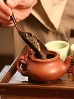 The tea pots are much smaller than typically found in the West, holding just 1-2 cups, or 8 ounces of liquid. Since the clay absorbs some of the tea's essence, different pots are used for different types of tea. The tea pots and cups sit on a special slatted bamboo box to drain and hold the excess liquid that is poured over the tea pots.